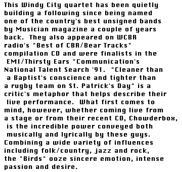 If you are using Netscape 3.0 or a browser that has a configured audio player, you can simply click on a song below for a 30 second sample from Chowderbox. The aifc sample transfers 3 times faster than the wav sample.